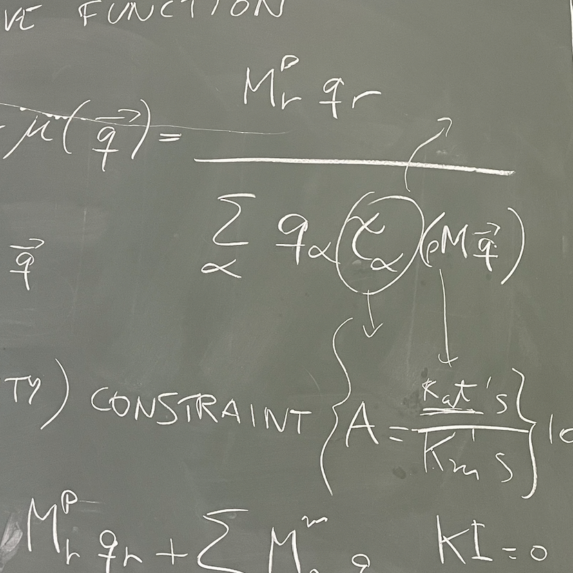Abstract: Self-replicating cells face a fundamental trade-off: they must allocate limited biomass resources among biosynthesis, metabolism, and maintenance while sustaining the fastest possible growth rate. Growth Balance Analysis (GBA) is a minimal, physics-like framework that formalizes this general trade-off under a few basic assumptions about self-replicating cells at balanced growth: they must grow by producing all of its components (including intermediate metabolites as well the proteins that catalyze the biochemical reactions), conserve mass, obey kinetic rate laws, and maintain constant density over time. We then formulate the corresponding fitness optimization problem on independent coordinates in close analogy to fundamental theories in physics. The resulting analytical predictions reveal optimal relationships between biochemical reaction fluxes, biomass composition, and growth rate. In this chalk talk, I will outline the core ideas of GBA, show how it unifies concepts from flux balance analysis and resource allocation theory, present some experimental validations, and discuss extensions of the framework to dynamics. The aim is to show that even complex growth phenomena can be understood from simple first principles.